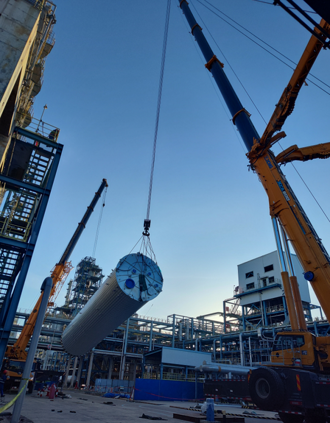 该批脱气料仓单台直径4.76米、总长27.7米,吊装重量达23吨,安装难度较大。为确保料仓顺利安装就位,中化能源工程项目中心组织制造、运输、施工、监理等单位高效协同,针对质量管控、运输路线勘察、吊装方案设计等环节,周密部署、压实责任:制造阶段强化焊接质量监督;运输阶段对物流车辆精准选型,并规划最优路线;吊装采用“单主机台吊递送法”,确保安全高效。项目避开开工高峰期,顺利完成料仓吊装,实现施工与生产两不误。